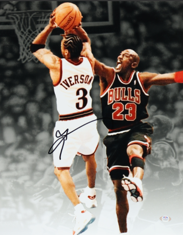 Photo measures 16" x 20" in size and has been hand-signed by Allen Iverson (Philadelphia 76ers, HOF).
