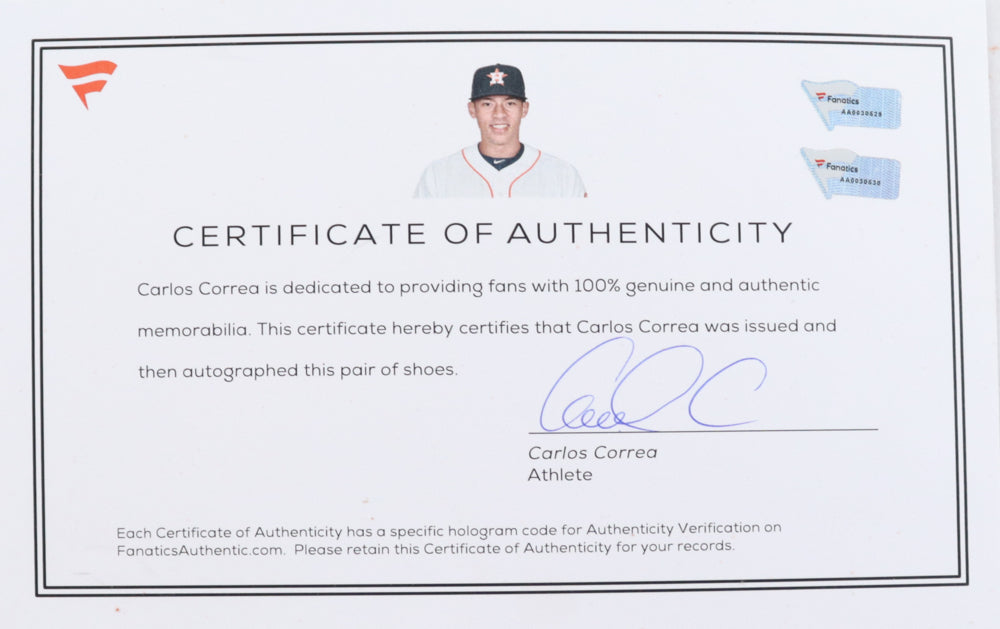Pair of game-used baseball shoes, size 12. Both shoes have been hand-signed by Carlos Correa (Houston Astros).