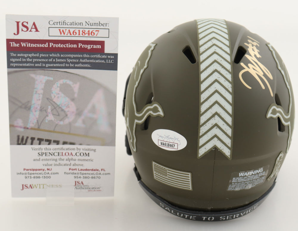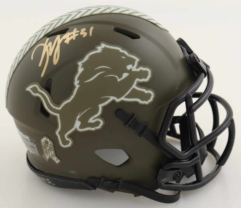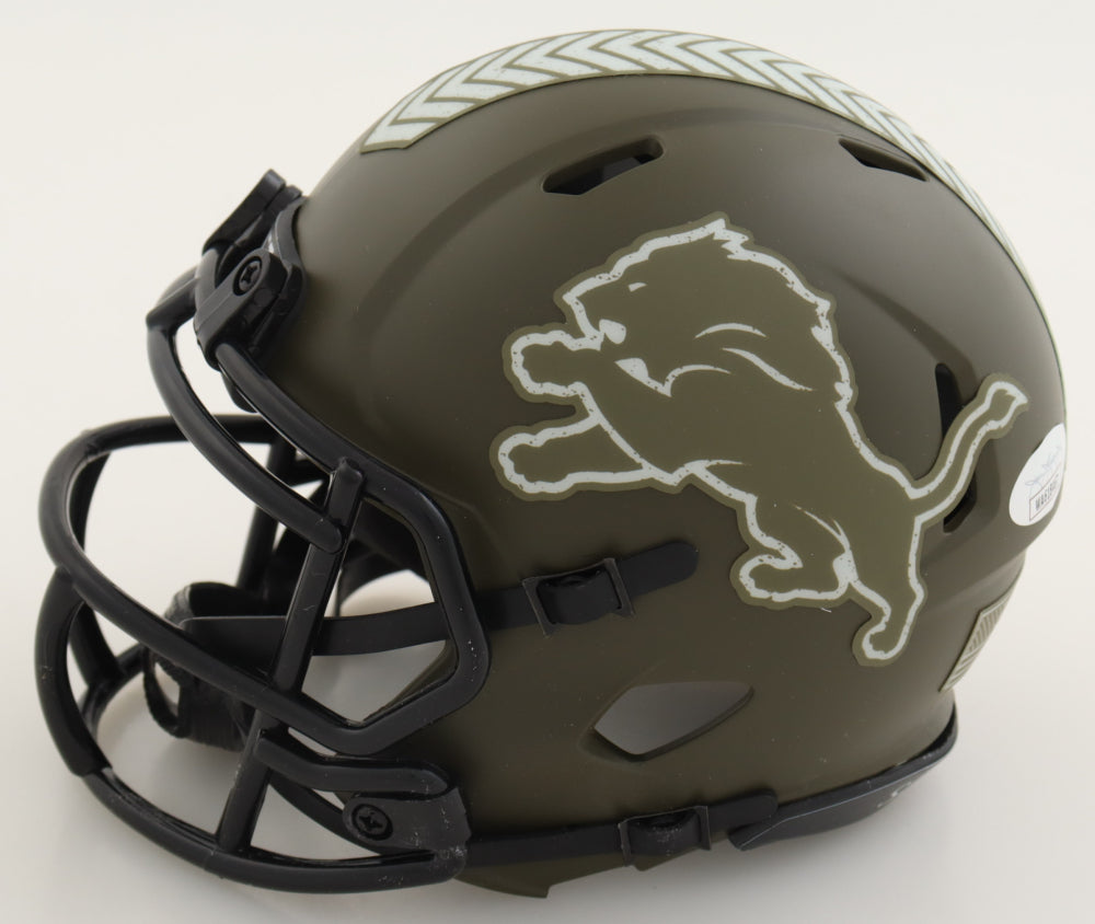 Riddell Detroit Lions Salute to Service Alternate speed mini helmet. Hand-signed by Kerby Joseph.