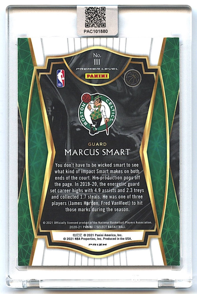 2020-21 Select Prizms Red White Orange Shimmer #111 card. Has been hand-signed by Marcus Smart (Boston Celtics).